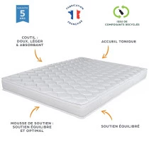 Les matelas à ressorts sont un choix populaire grâce à leur capacité à offrir un soutien ferme et une aération optimale. Nos matelas à ressorts ensachés sont particulièrement appréciés pour leur capacité à s'adapter individuellement aux contours du corps, ce qui permet de réduire les points de pression et d'améliorer la circulation sanguine. Cette technologie garantit une indépendance de couchage, ce qui signifie que vous ne serez pas dérangé par les mouvements de votre partenaire pendant la nuit. Les matelas à ressorts bonnel, quant à eux, offrent un soutien plus uniforme, adapté à ceux qui préfèrent un matelas plus ferme. Ils sont parfaits pour les personnes qui ont besoin d'un bon maintien tout au long de la nuit. Accompagnés de sommiers à ressorts, ces ensembles de literie à ressorts offrent une base solide et renforcent la longévité de votre matelas, garantissant ainsi un confort durable. Un autre avantage majeur des matelas à ressorts est leur capacité à favoriser la ventilation. Grâce à leur structure à ressorts, l’air circule librement à travers le matelas, ce qui permet de maintenir une température agréable et d'éviter l'accumulation d'humidité. Ce système de ventilation naturel est essentiel pour ceux qui ont tendance à avoir chaud pendant la nuit ou qui vivent dans des climats plus chauds. Les sommiers tapissiers complètent cette ventilation en offrant un support supplémentaire tout en améliorant la circulation de l'air. Avec nos ensembles de literie à ressorts, vous profiterez d'un sommeil frais et confortable, sans l'inconfort causé par la chaleur ou l'humidité.